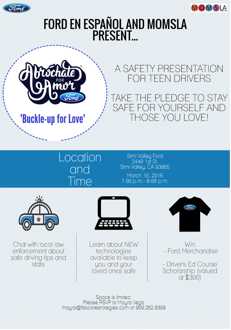 My friends and colleagues from MomsLA.com are hosting Abrochate del Amor (buckle up for love), an event to promote safe driving practices among teens. Bring your new or upcoming driver to Simi Valley Ford next Thursday at 7pm (see RSVP details in the flyer). The event is FREE.