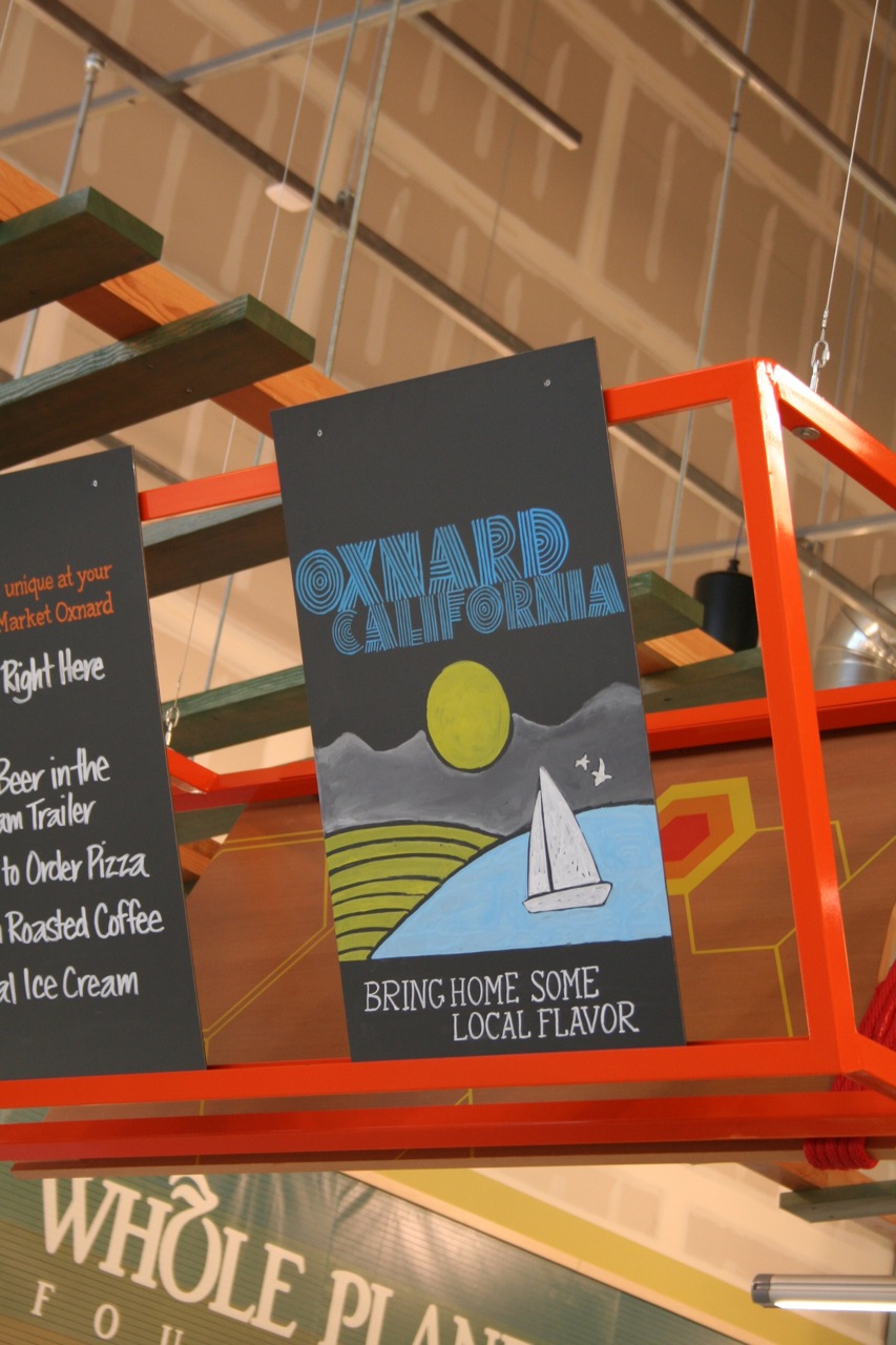 But unlike those other stores, which could be dropped down in Anywhere, USA, this location of Whole Foods incorporates elements into its design that are uniquely Oxnard. Window coverings and backdrops are made of sailcloth. Signs are adorned with lines and trim from sailboats. A beautiful beach-themed mural covers the back of the store.