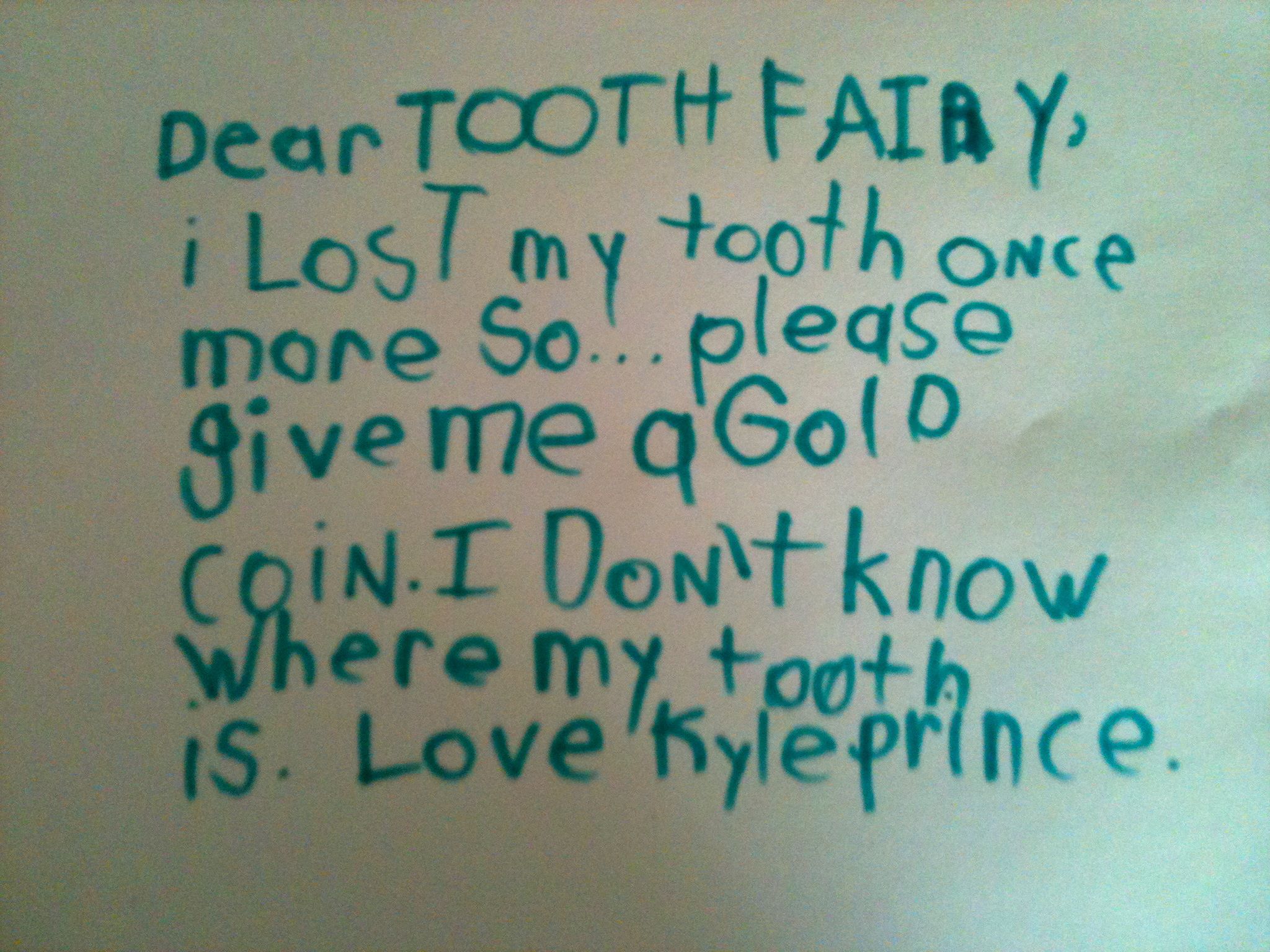 Undaunted, Kyle decided to write a letter to the tooth fairy explaining what happened so that she would still leave a gold coin under his pillow. He did this all by himself, with minimal spelling help from me.