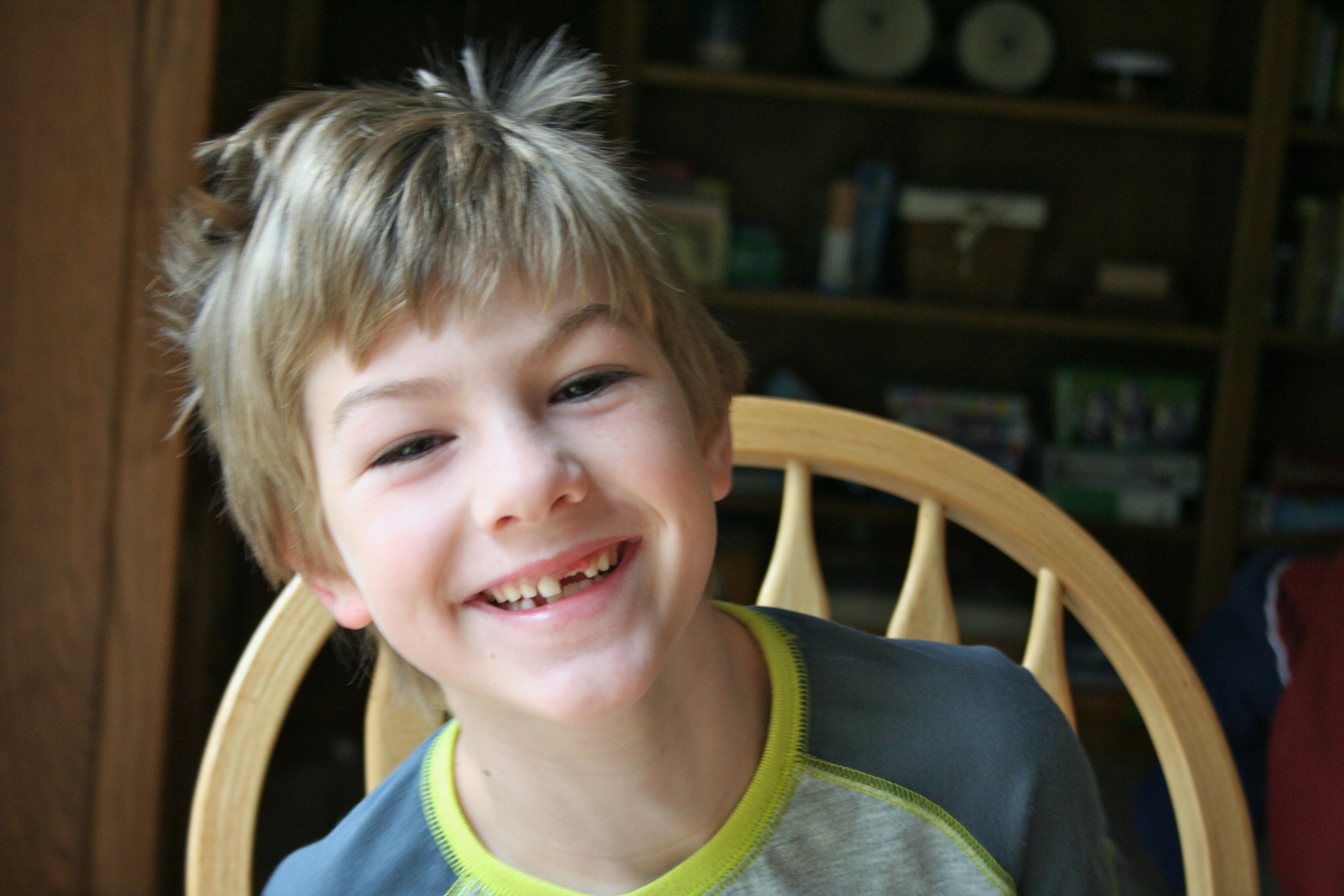 With the loss of his first front tooth, it seems Kyle is officially in that gawky little boy stage. He walked around with this tooth hanging by a string for weeks. Finally it fell out, leaving the proverbial gap – but a new tooth already visible in its place! Alas, when the tooth fell, Kyle didn’t see where it went, and if you’ve ever tried to get a 6-year-old to retrace his steps so you can find what he lost, then you will understand the two of us on hands and knees scrutinizing the berber carpet in the upstairs hallway. I have no idea where that darn tooth went.