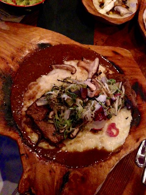 We tried the short rib birria dish, which is braised beef short ribs, topped with grilled frisee tomato salad and sautéed shitake mushrooms and served over pureed potatoes. The beef was so tender and savory, this was a very close second to the shrimp tacos. There was nothing left over.