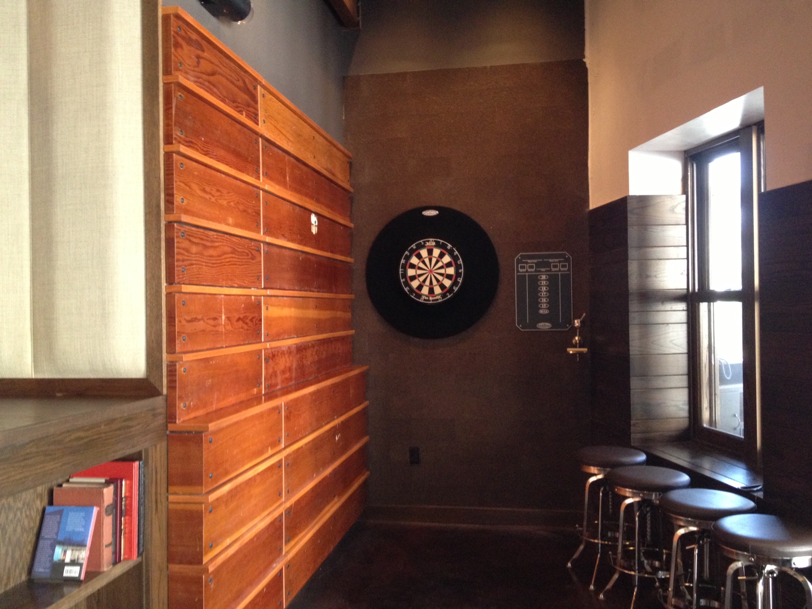 The interior of PS 105 is resplendent with construction materials like wood and steel, props that support its theme including a small wall made of bleachers and a larger wall festooned with lacquered vintage catcher’s mitts. The space is open and utilitarian with a large window into the kitchen, industrial light fixtures, and austere tabletops. There are plenty of nooks but only one large table for big groups. Marketing director Karen Sabourin told me that there is a space for larger parties behind The Grill next door; maybe they’ll borrow it in the future.