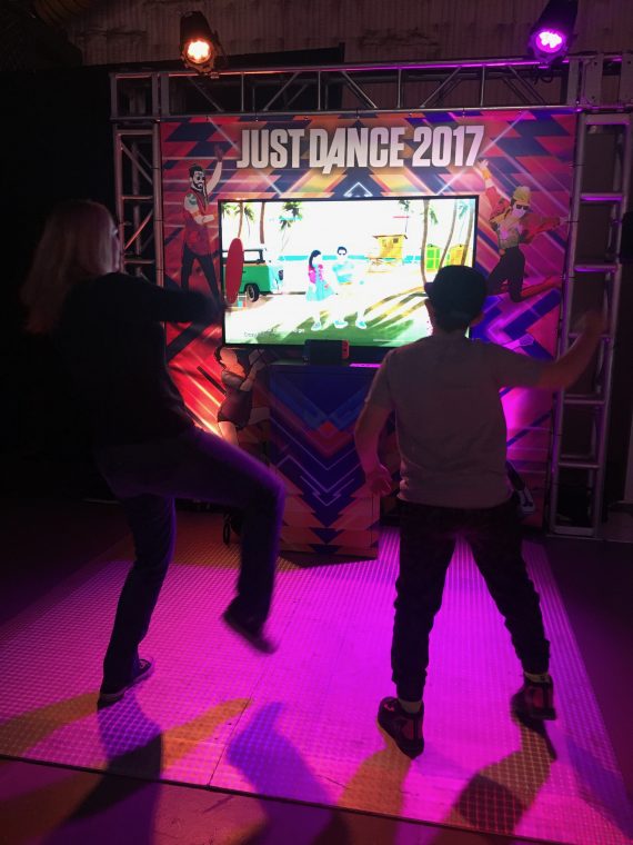 You can barely see the Joy-Cons in our hands because they are so small. It makes dancing much easier than with the bulkier Wii U remotes. In these pictures we are totally rocking out to “Cake by the Ocean.” The kid beat me with his sick moves.