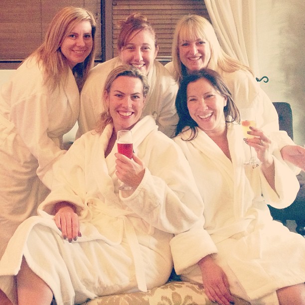 I was the only dork who didn’t bring my phone into the room. Hello, it’s a spa, a place to relax, so I didn’t want the stress of feeling like I needed to take a ton of pictures. Besides, I was getting a neck and foot massage and drinking champagne at 1pm. Also, we were all in robes and bathing suits, and I figured my friends would all shy away from the camera. I was wrong.