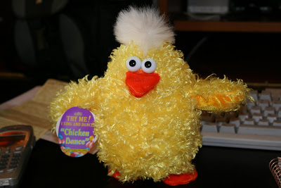 If you squeeze the chicken’s wing, it plays The Chicken Dance. Stewart taught Kyle the moves, so now when he plays the music he flaps his arms, grins from ear to ear, and spazzes out.