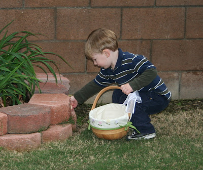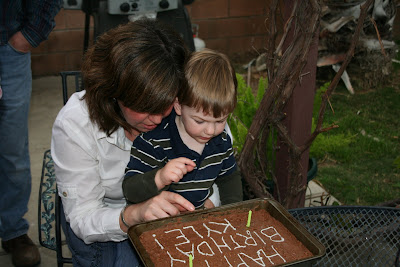 After dinner we headed outside to hide and find the Easter eggs that I had colored the night before. It took some, okay a lot of, coaxing, but once Kyle got into the swing of things he found all six of the eggs and then proceeded to take them out of the basket and count them, then put them back in and count them, and repeat, etc. etc. So by the time we were ready to present the cake and sing Happy Birthday for real, he was totally distracted and the eggs were, in effect, toast. Cracked and bruised and licked by the dog and stinking. So much for the hard-boiled egg breakfast I had planned for this morning.
