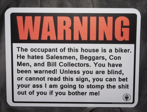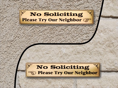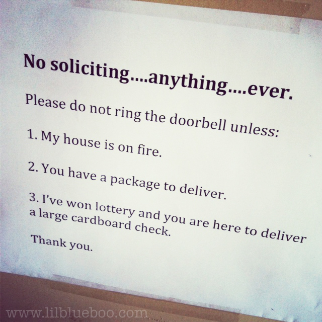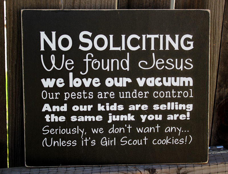 I am a nice person. Until I’m not. I realized it might help to put a “no soliciting” sign on the front door, so I did a little search and most of them were just lame. Here are six that I loved: