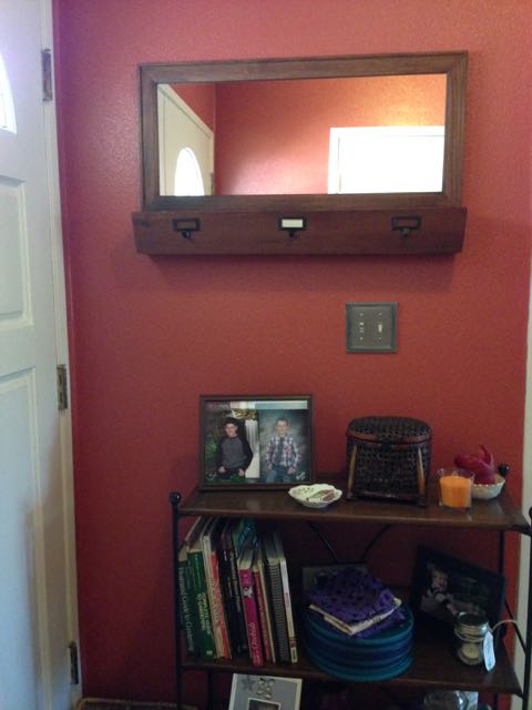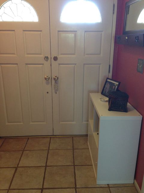 One afternoon of cursing and sweating was all it took to create this command center. I banished all shoes to their proper closets, unless it’s boys’ everyday shoes. Those go in the bottom cubby behind closed doors. Backpacks go in the top cubby. Husband’s wallet and keys go in the basket on the top shelf. Jackets are hung in the front hall closet on the other side of the hallway. (What? That’s not for random junk?)