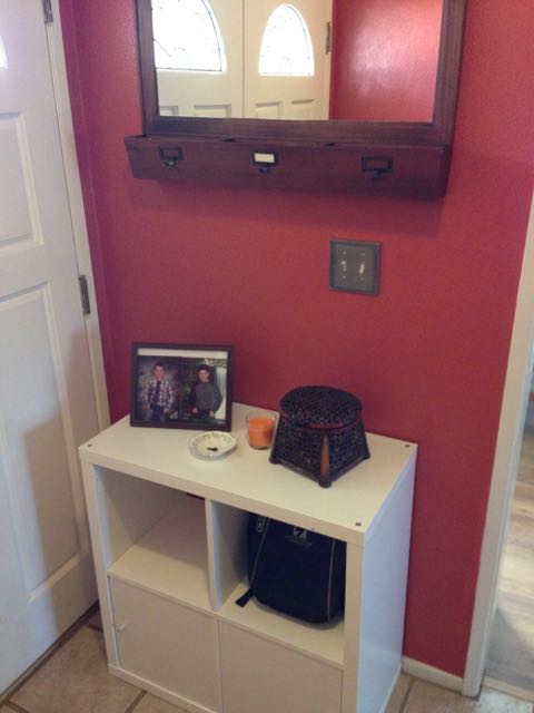 Originally I envisioned a mirror with hooks on the wall for hanging jackets and backpacks, with a storage unit/bench to hold shoes and serve as a seat for putting on and taking those shoes off. But Brady wanted a “cubby,” and since he and his brother would be the ones using it, I relented and got the 4-unit Kallax shelf. He wanted all 4 cubes to have doors, but I put my foot down on that one—mostly because those doors were a giant PITA to put in, but also because backpacks are bulky and tend to hang over the edge of the shelf.