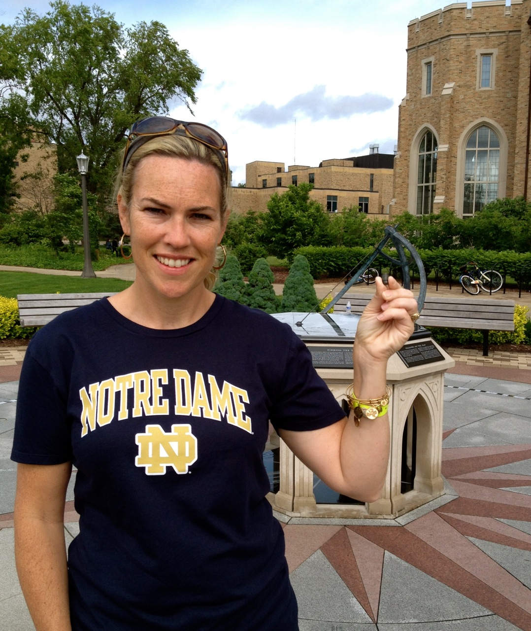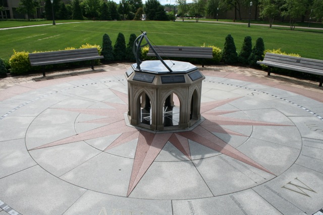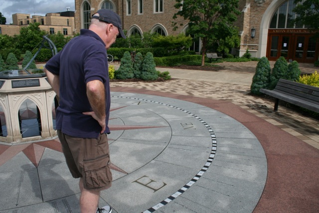I am standing outside the new Jordan Hall of Science at the O’Neill Sundial, an epic creation that “sits on a plaza inlaid with three types of granite to form a 32 foot diameter compass rose, with sunrise and sunset times shown for sixteen dates special to Notre Dame University.”