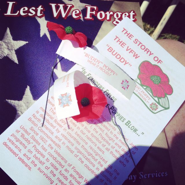 It was a hot day, and I hadn’t brought snacks or water, so the children were restless although they asked a lot of questions about the wars and the different military services and I answered them if I could. On the way back to the car, my older son stopped to talk with the men handing out poppies. He told them how his Great Grampa, who died in 2012 at the age of 93, was a soldier in WWII. He put a dollar in the jar and proudly accepted a poppy to wear in remembrance.