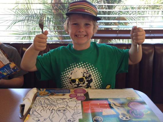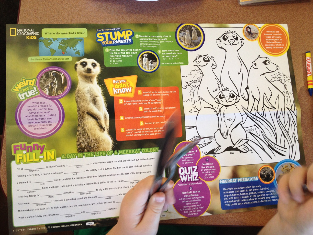 Denny’s has partnered with National Geographic Kids to present an interactive placemat/worksheet/menu that has a QR code on it that takes you to a NatGeo app. Meerkats and other desert dwellers star in the version we had at our meal. There is a coloring section, a Mad-Libs type quiz, and “Weird But True” facts, which my kids love. They have a whole book of them!