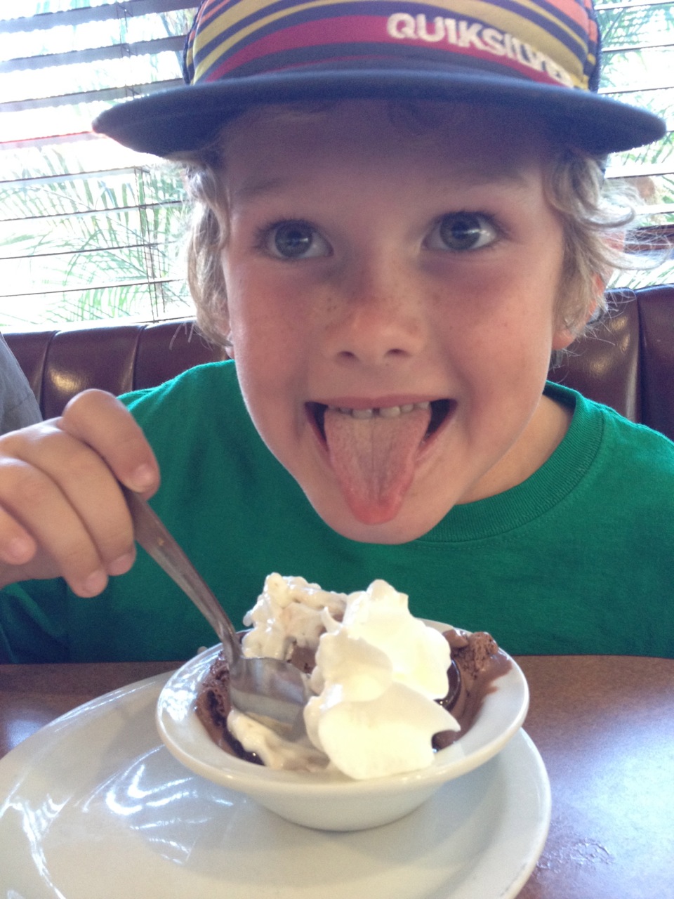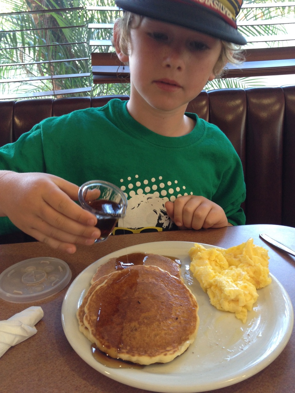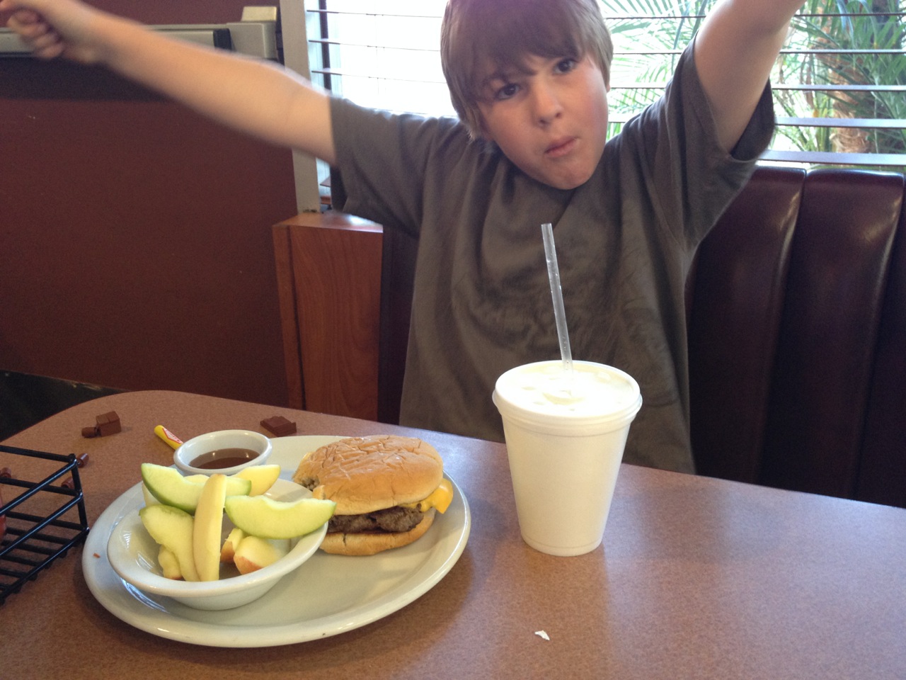 My kids had their old stand-bys: a burger and fruit for Kyle and pancakes for Brady.