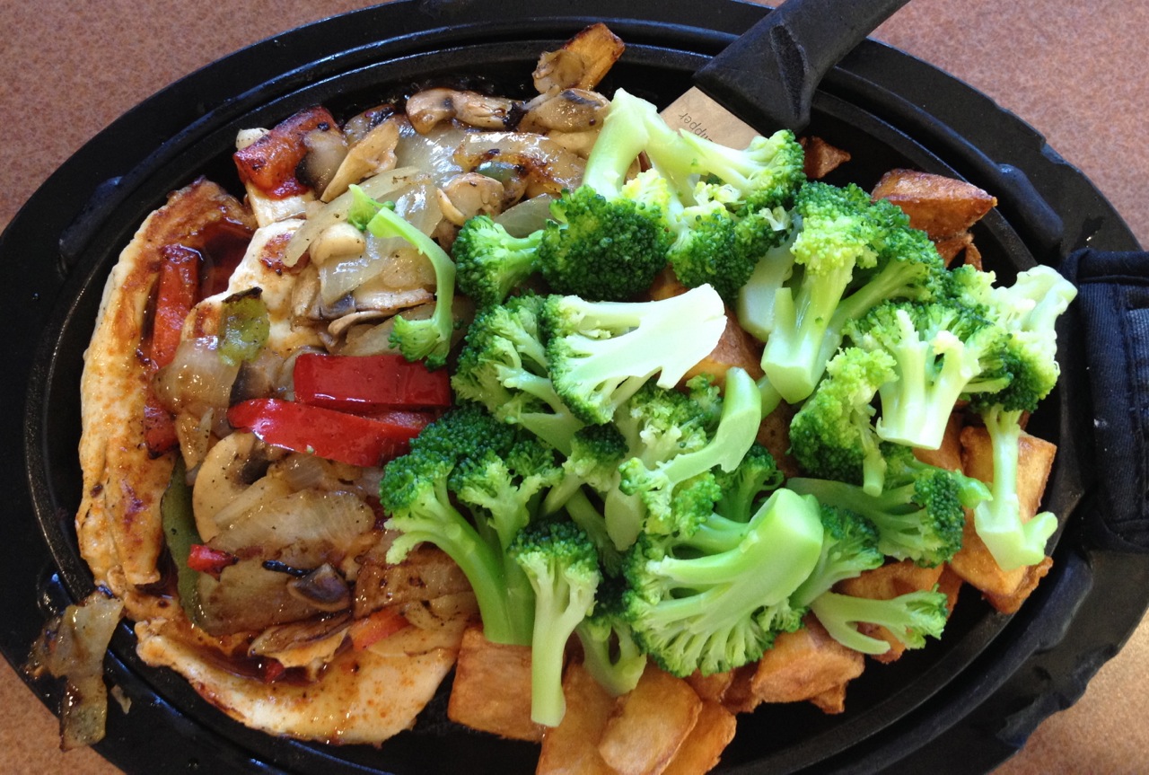 As for me, I decided to get indulgent and try the bourbon chicken skillet. It was topped with a mountain of steamed vegetables so you can barely see the chicken, but everything was delicious and I ate most of it!