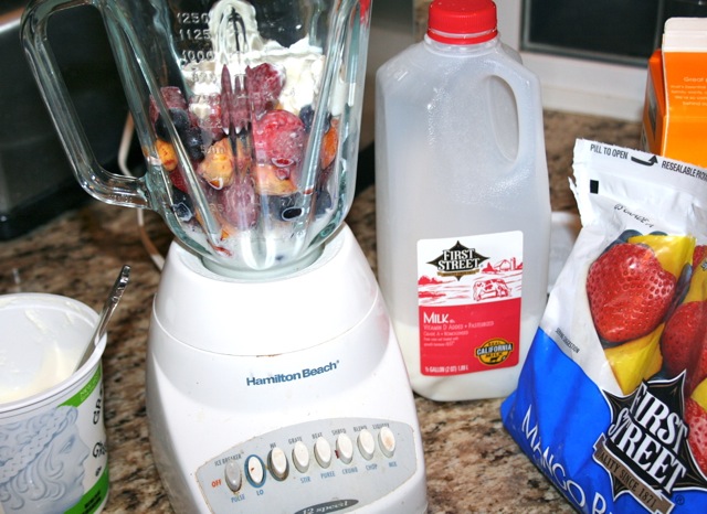 I know it’s not rocket science, but that’s what makes it easy for kids to help, and for pre-coffee mom to make it. I don’t know about yours, but my kids are up at the crack of dawn on days they don’t have school! Use frozen fruit so you don’t have to bother adding ice.
