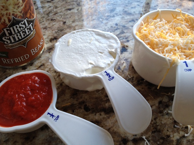 1. Mix beans, red pepper puree, sour cream, and cheese in a bowl.